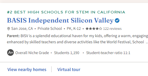 Basis是一所位于美國(guó)西部加州圣何塞的一所5-12年級(jí)的走讀學(xué)校。學(xué)校距離硅谷很近,周?chē)兴固垢4髮W(xué)等頂級(jí)世界名校。開(kāi)車(chē)20分鐘就能到斯坦福大學(xué)的校園。學(xué)校在加州地區(qū)擁有最強(qiáng)的STEM課程。提供134門(mén)課程,2019年學(xué)校的學(xué)生參加了1355門(mén)AP考試。有58.2%的BASIS的學(xué)生通過(guò)了AP考試。從1998年第一所基礎(chǔ)課程學(xué)校成立后,這個(gè)學(xué)術(shù)項(xiàng)目很快因其廣度、深度和成功地向年輕學(xué)生教授高水平內(nèi)容和批判性思維的能力而眾所周知。