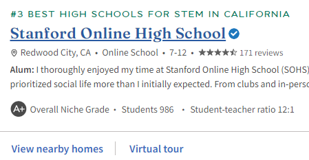 斯坦福在線高中是一所位于加州斯坦福的在線高中,學(xué)校于2006年在馬洛家庭基金會(huì)的支持之下成立于斯坦福大學(xué)內(nèi)部。斯坦福在線高中為學(xué)生打造了一個(gè)全球?qū)W習(xí)社區(qū),學(xué)校由不同地區(qū)充滿好奇心的老師和學(xué)生。該校在課堂之外通過(guò)嚴(yán)格的課程挑戰(zhàn)和活動(dòng)充分引導(dǎo)學(xué)生進(jìn)行理性思考、分析和創(chuàng)造。在課程內(nèi)外為學(xué)生和教師保持勒緊密的人際關(guān)系,支持性的環(huán)境為學(xué)生獨(dú)立成長(zhǎng)和追求知識(shí)提供了必要條件。