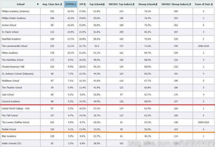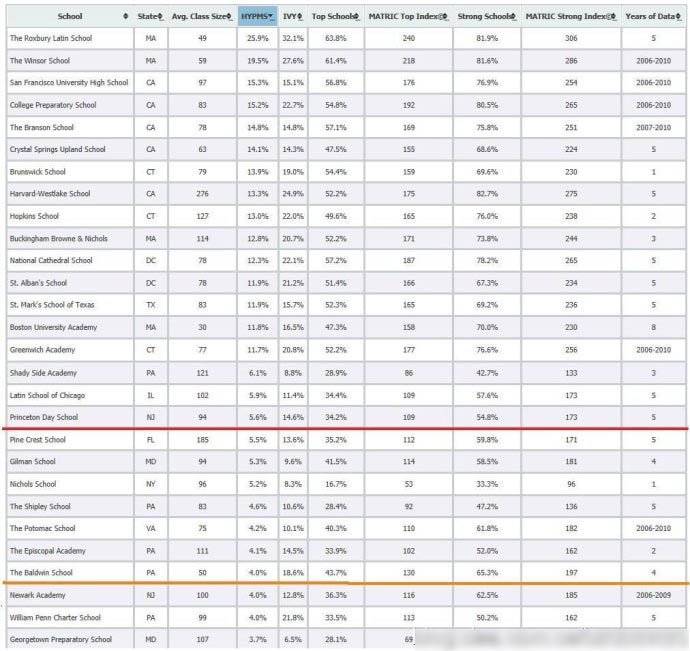 表單體現(xiàn)內(nèi)容依次是:Avg. Class Size(平均年級人數(shù))、HYPMS(哈佛、耶魯、普林斯頓、斯坦福和麻省理工大學(xué))、IVY(爬藤)、Top School (排名前25名大學(xué)或前15的文理學(xué)院)、Strong School(排名前50名大學(xué)或前30名文理學(xué)院)、Years of Data(多少年的累計數(shù)據(jù))。