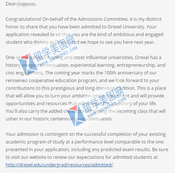 恭喜留學美國網(wǎng)Z同學獲得德雷塞爾大學drexel university錄取offer