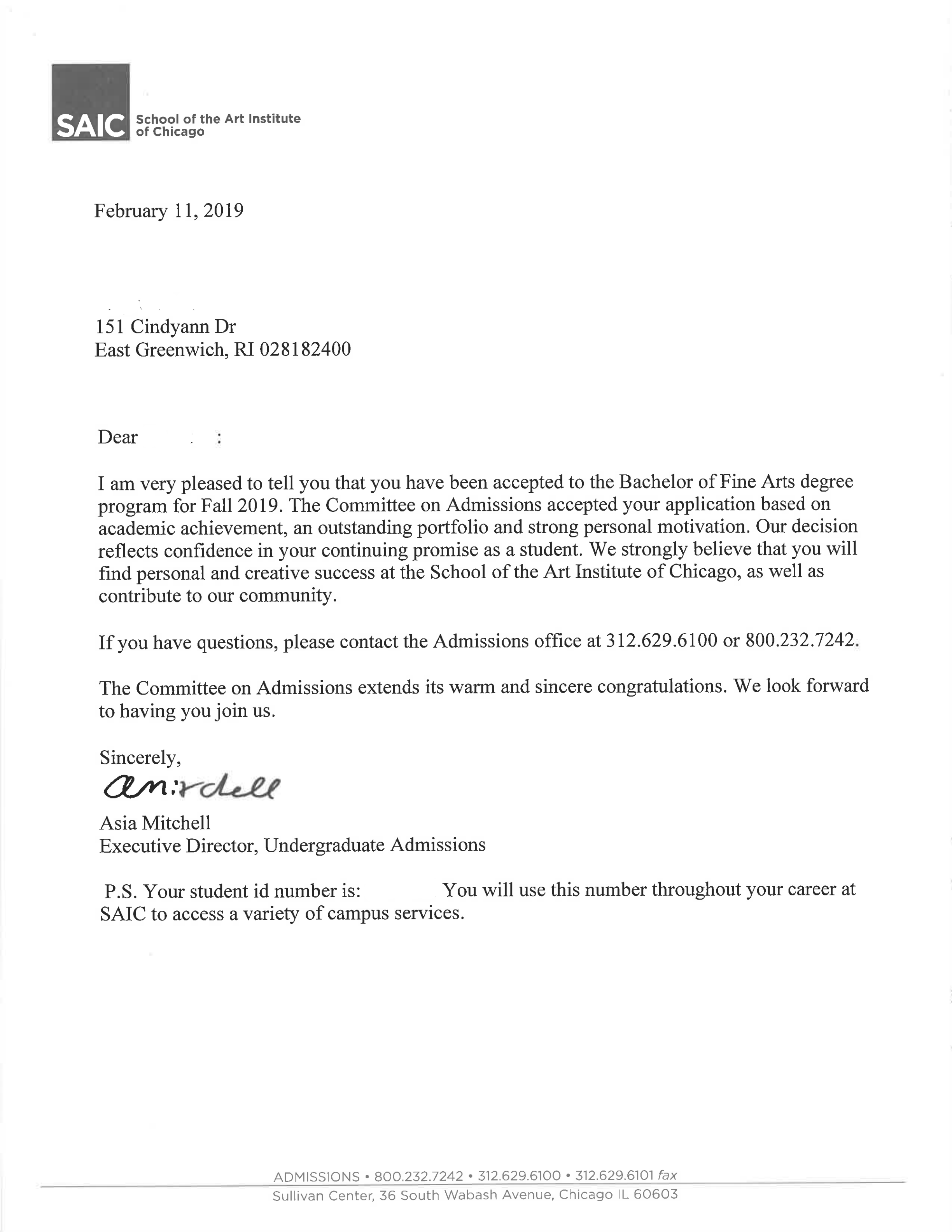 恭喜Z同學(xué)收獲芝加哥藝術(shù)學(xué)院Offer