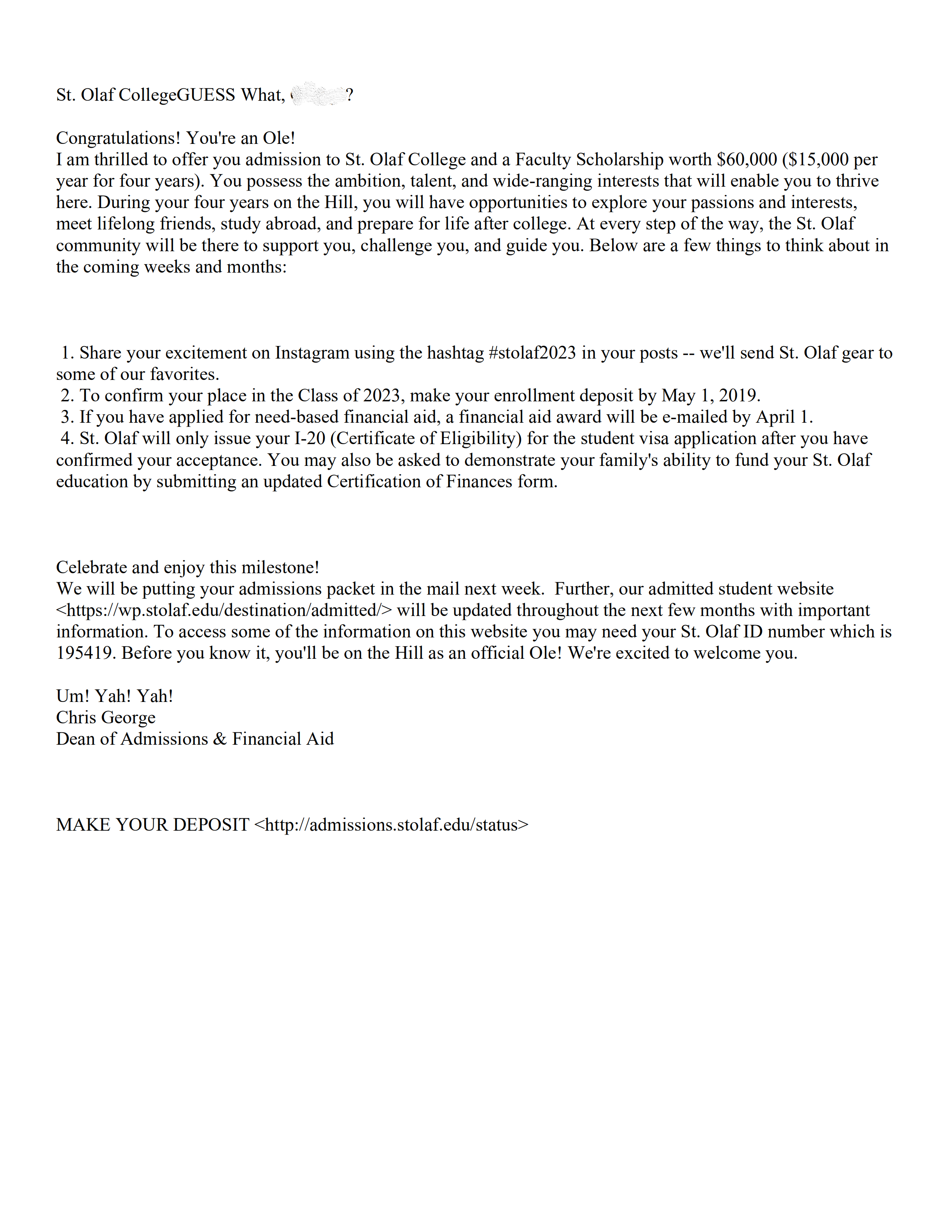 恭喜留學(xué)美國(guó)網(wǎng)L同學(xué)被St.Olaf成功錄取