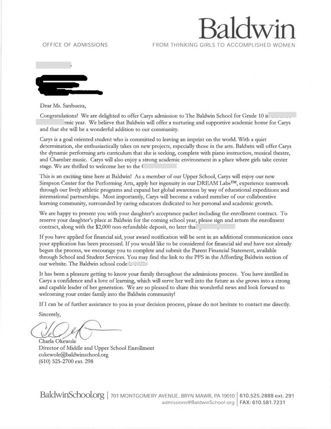 恭喜留學(xué)美國網(wǎng)L同學(xué)成功拿到了鮑德溫女校的offer,L同學(xué)其實(shí)是很獨(dú)立的女孩子,對學(xué)校又非常的有自己的主見,自己申請了一些寄宿學(xué)校,無奈全部落空,所以她找到我們的時候已經(jīng)非常晚了,大部分學(xué)校已經(jīng)關(guān)閉申請,好學(xué)校的名額更是極其有限。