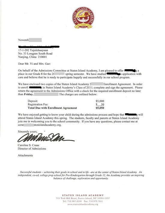 恭喜留美網(wǎng)Y同學(xué)獲得斯泰頓島學(xué)院(Staten Island Academy)錄取Offer。非常感謝Y同學(xué)家長(zhǎng)的信任,家長(zhǎng)非常感謝留美網(wǎng)石老師團(tuán)隊(duì)給予的支持,在最后關(guān)鍵時(shí)刻成功幫助申請(qǐng)斯泰頓島中學(xué),我們會(huì)再接再厲做好每一位簽約的學(xué)生。