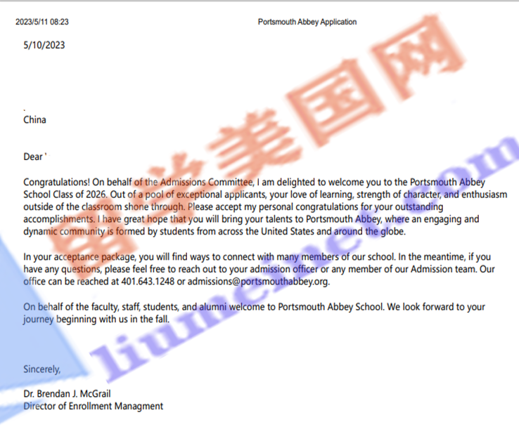 功夫不負(fù)有心人,后面終于在第一時(shí)間拿到了補(bǔ)錄名額,L同學(xué)本身是個(gè)非常有愛心的孩子,我們在文書中也著重強(qiáng)調(diào)了這一點(diǎn),我們將早已打磨整理好的、凸顯宗教信仰的文書和申請材料遞交給學(xué)校的招生官,爭取到了面試機(jī)會(huì),并最終成功斬獲了樸茨茅斯修道院Portsmouth Abbey School的錄取offer。