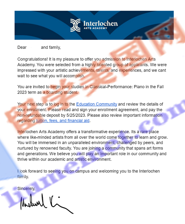 錄取學(xué)校:因特勞肯藝術(shù)學(xué)院Interlochen Arts Academy