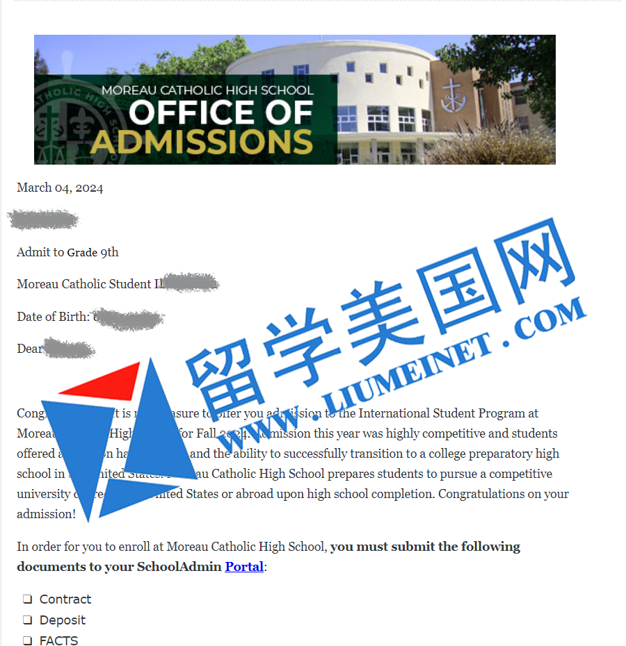 【錄取喜報】恭喜留美網(wǎng)L同學(xué)收獲Moreau Catholic High School 莫若天主教高中錄取