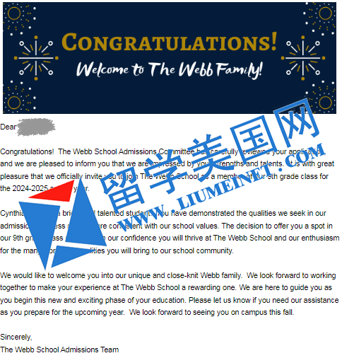 恭喜S同學收獲韋伯中學The Webb School 錄取offer。我們衷心祝賀S同學,她有很不錯的獨立能力和很好的深入研究能力。能夠拿到錄取是她不斷努力的結(jié)果,同時也是留美網(wǎng)和學生家庭互相配合的成果。祝愿S同學能夠珍視這樣的機會,能夠保持對知識的渴望,同時學會利用機會彌補自身的弱點,同時在美高獲得理想的學習成果。