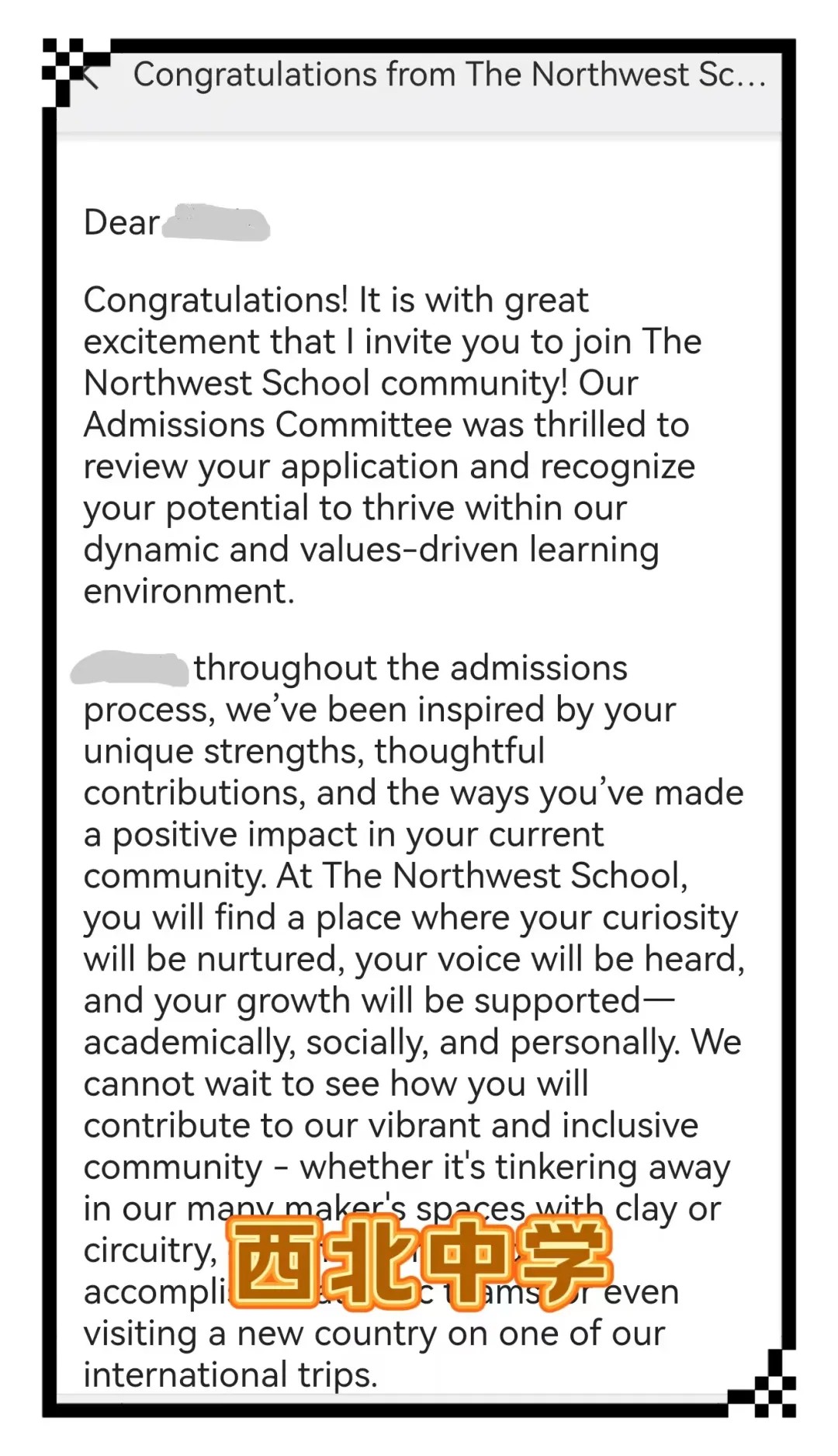 恭喜留美網Y同學收獲西北中學錄取offer!
