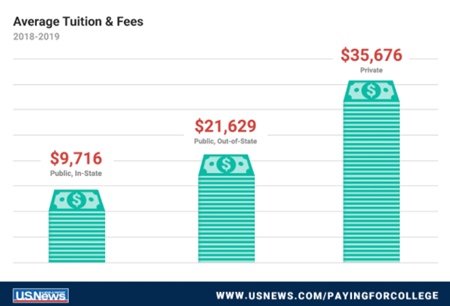 美國新聞數(shù)據(jù)顯示,州內(nèi)公立大學的平均學費和私立學院的平均學費比2018-2019學年的9,716美元低73%,而美國新聞數(shù)據(jù)顯示為35,676美元。據(jù)美國新聞報道,737家私立大學的學費和收費數(shù)據(jù)顯示,在美國新聞排名的私立大學中,超過100所私立大學在本學年的標價中收取至少50,000美元或以上的費用。