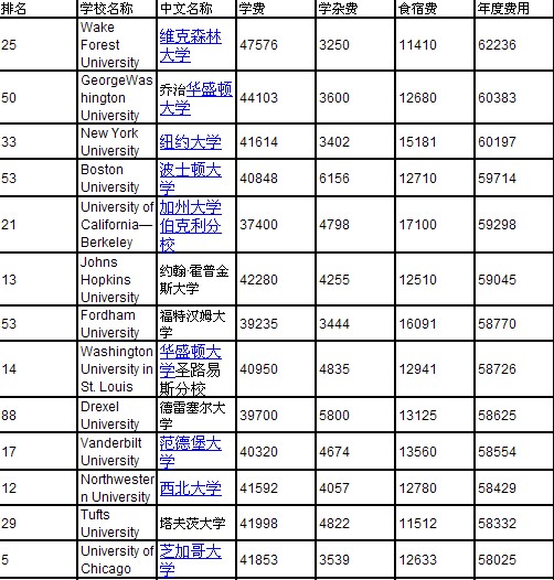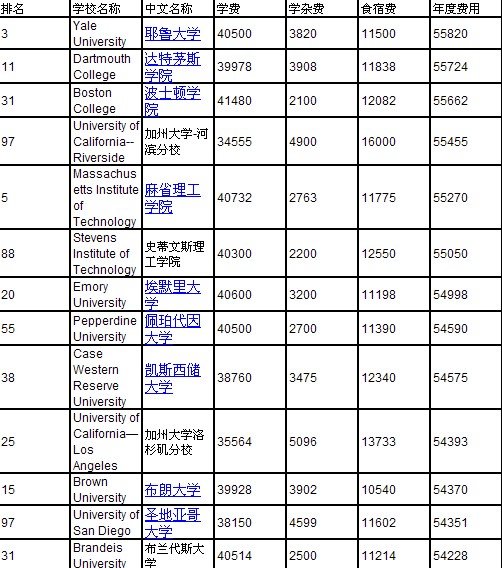 美國(guó)大學(xué)年度費(fèi)用在$56,000以上的學(xué)校及具體費(fèi)用: (單位:美元/年)