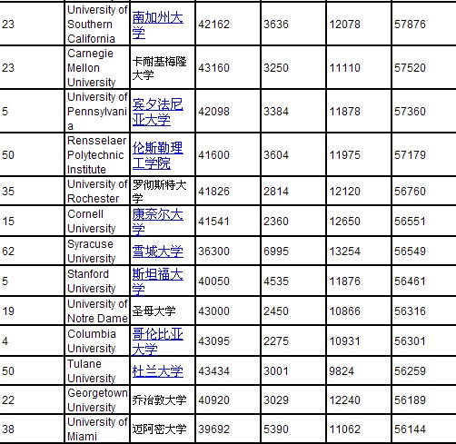 美國(guó)大學(xué)費(fèi)用在$50,000-$56,000的學(xué)校及具體費(fèi)用:(單位:美元/年)