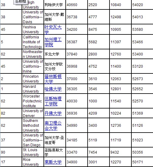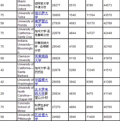 美國(guó)大學(xué)費(fèi)用在$40,000-$50,000的學(xué)校及具體費(fèi)用:(單位:美元/年)