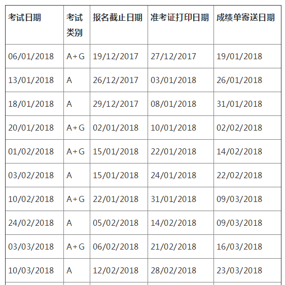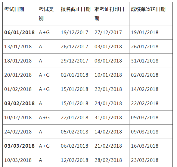 2018年1月至6月用于英國簽證及移民的雅思考試報名截止日期、準(zhǔn)考證打印日期和成績單寄送日期