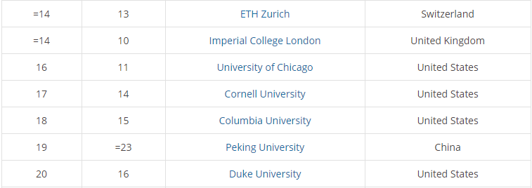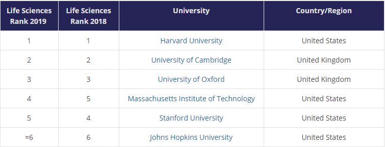 2019年全球最佳生命科學(xué)專業(yè)排名