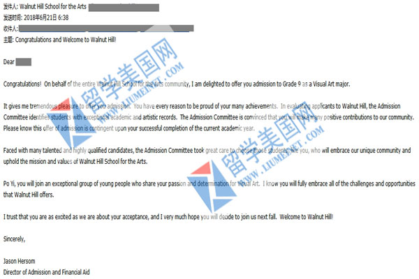留美網(wǎng)C同學(xué)被胡桃山藝術(shù)高中學(xué)校Walnut Hill School錄取offer展示