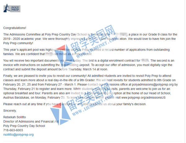 留美網(wǎng)W同學(xué)被波利預(yù)備學(xué)校Poly Prep Country day school錄取Offer展示