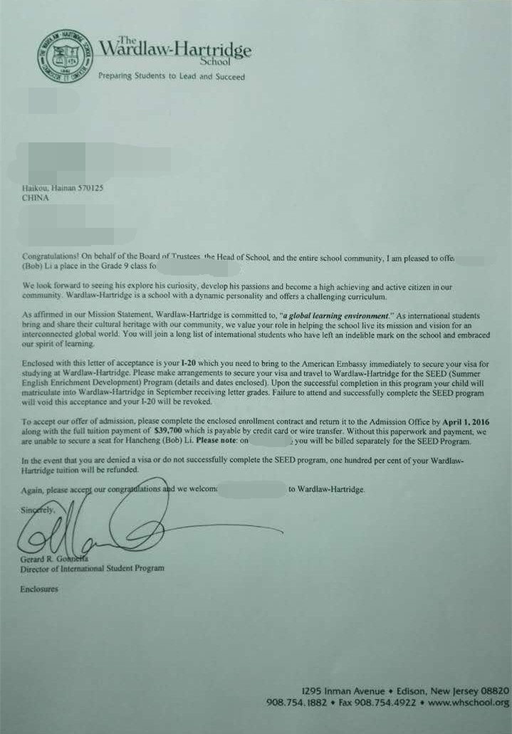 留美網L同學被Wardlaw-Hartridge School沃德洛-哈特睿智學校錄取Offer展示