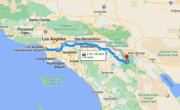 洛杉磯國際機場(Los Angeles International Airport,LAX)距離約2.5小時車程,是加州最大國際機場之一,適合長途國際旅行。