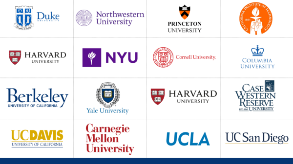 伯克利音樂學院、波士頓學院、波士頓大學、加州理工學院、加利福尼亞州立大學系統(tǒng)、卡內(nèi)基梅隆大學、凱斯西儲大學、哥倫比亞大學、康奈爾大學、杜克大學、哈佛大學、約翰霍普金斯大學、紐約大學、西北大學、佩珀代因大學、普林斯頓大學、倫斯勒理工學院、羅德島設計學院、羅切斯特理工學院、斯坦福大學、雪城大學等。