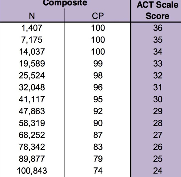 這一年中,一共有1407個(gè)學(xué)霸拿到了36分的滿分。如果你的ACT成績(jī)達(dá)到了30分,那么你就躋身到全美最優(yōu)秀的5%的學(xué)生當(dāng)中。成績(jī)分布和百分比如下圖所示: