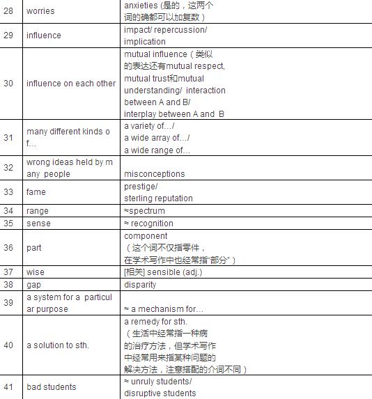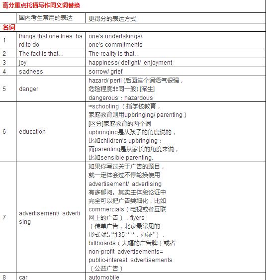 在ETS規(guī)定的托福獨立寫作評分標(biāo)準(zhǔn)中,有一項是針對詞匯和表達的,同樣托福寫作想要拿高分,在詞匯的應(yīng)用上也要有一定的技巧,整理了一些托福寫作重點詞匯的高分替換,希望可以幫助大家~~ 高分重點托福寫作同義詞替換