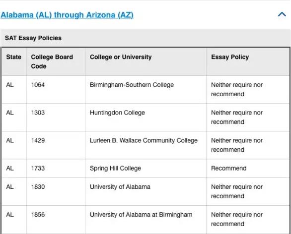 學校們已經就是否要求新SAT考試中可選的寫作部分與College Board進行了討論,College Board 美國大學理事會則列了一份清單,詳情請見: