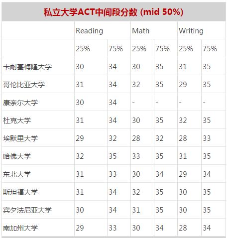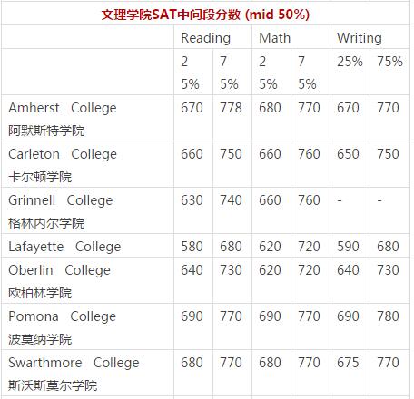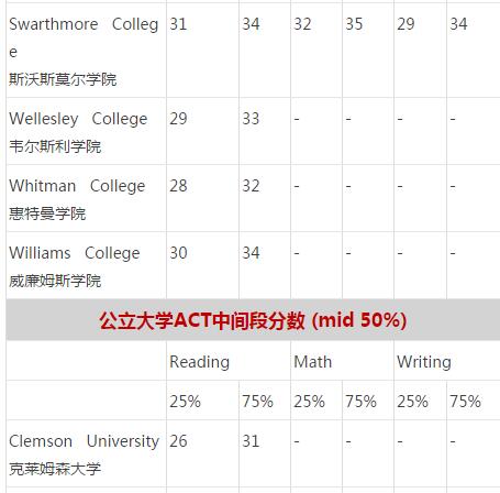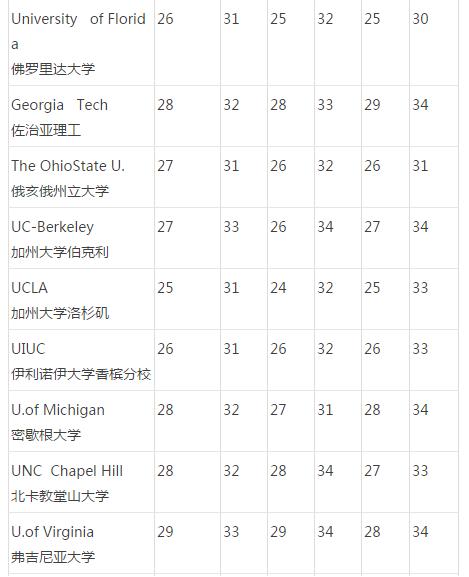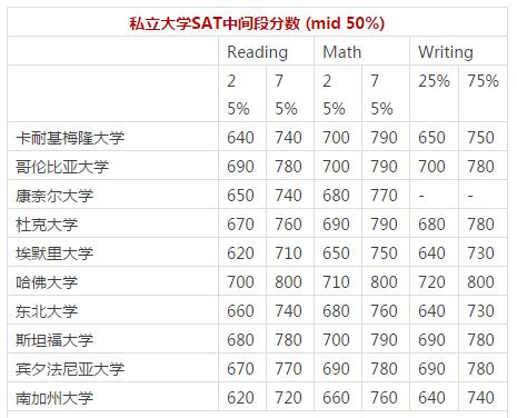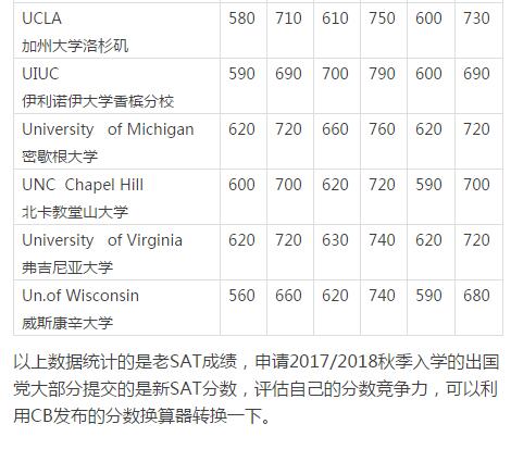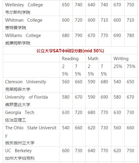 下面幾個(gè)表格是各類型大學(xué)錄取學(xué)生的老SAT/ACT中間段成績(jī),每一個(gè)單項(xiàng)也詳細(xì)列出來了。一般來說,中國(guó)學(xué)生的SAT數(shù)學(xué)會(huì)高于平均分,但SAT閱讀達(dá)650分以上的不多。
