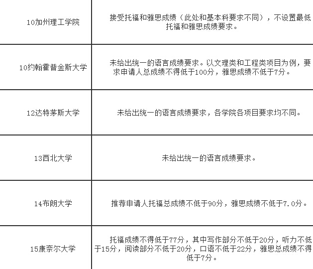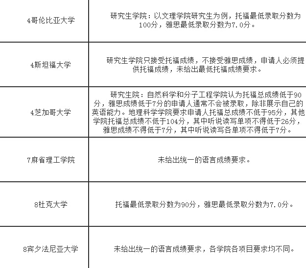本文列出美國TOP 100 大學研究生最低語言要求,專業(yè)不同要求不同,本文只能能根據(jù)研究生院的最低要求給出參考,具體還需申請查找自己專業(yè)的頁面。