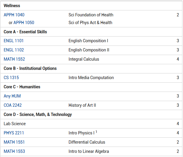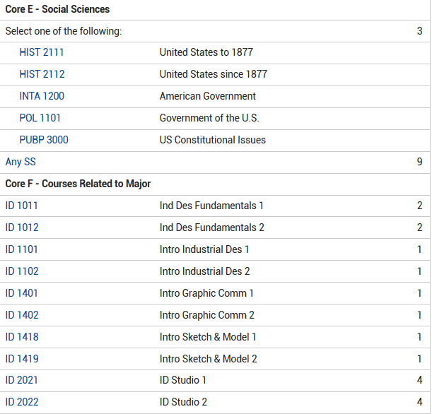 所有需要的工業(yè)設(shè)計(jì)課程必須用C或更高的一個(gè)檔次完成。只有滿足這個(gè)要求才能進(jìn)入更高級(jí)的工業(yè)設(shè)計(jì)工作室繼續(xù)學(xué)業(yè),無(wú)法滿足該條件的學(xué)生可能會(huì)被要求延長(zhǎng)一年的學(xué)業(yè)。工作室設(shè)計(jì)的課程只對(duì)應(yīng)秋季的時(shí)間表。最多9學(xué)分可作為學(xué)生合格還是不合格的依據(jù)。