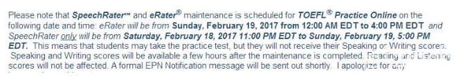 ETS(美國(guó)教育考試服務(wù)中心Educational Testing Service縮寫)最新通知,TPO口語(yǔ)和寫作評(píng)分系統(tǒng)將進(jìn)行維護(hù),具體維護(hù)時(shí)間如下: