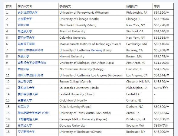 2017年美國(guó)USNews金融專業(yè)最新TOP20排名