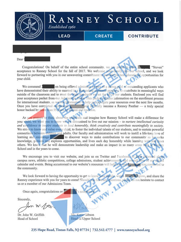 恭喜SXY同學獲得Ranney School蘭尼學校錄取offer
