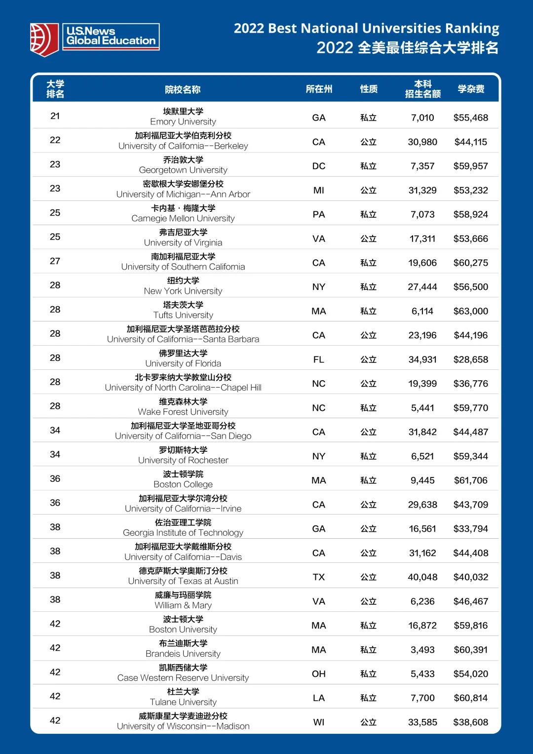 USnews2022美國大學(xué)排名!UC系三所躋身前30!